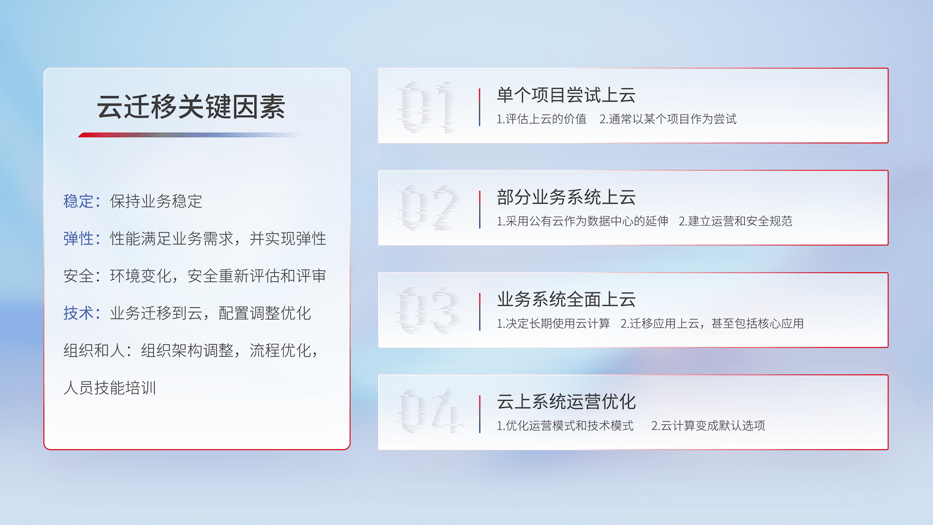 结合实际业务,,,从规划设计、、、云平台选型、、、、云原生改造、、、数据迁移、、、、集成交付,,,迁移全过程为客户识别最佳上云路径,,,,做好风险识别管理,,设计网络架构、、身份权限、、、、安全审计合规、、、操作审计、、日志审计、、、监控告警策略、、、多站点容灾设计等,,,对云上基础设施进行整体规划,,,提升IT治理水平,,以满足弹性、、高可用、、、、高性能的需求。。