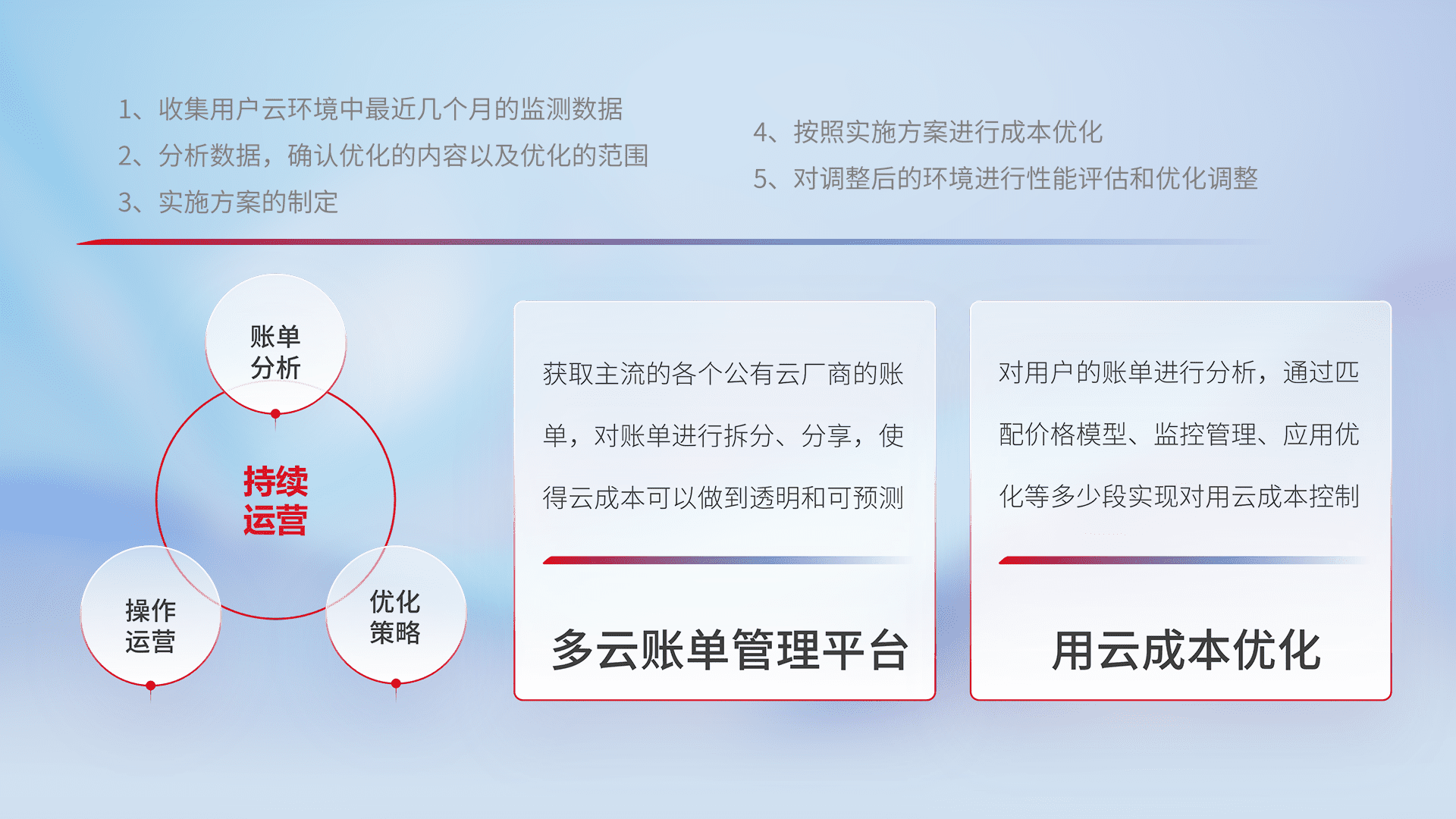 通过多云纳管,,以统一的资源数据模型把客户的云资源进行抽象和封装,,进而实现对多云资源的统一操作,,保障云资源管理的可靠性、、、、稳定性与可用性。。。量身定制化运维内容,,,,配置、、、、开发运维、、、补丁管理、、备份、、监控、、、、认证和访问管理、、、审计和日常巡检等,,,保障在用云过程中的可靠度,,稳定度以及高可用率。。